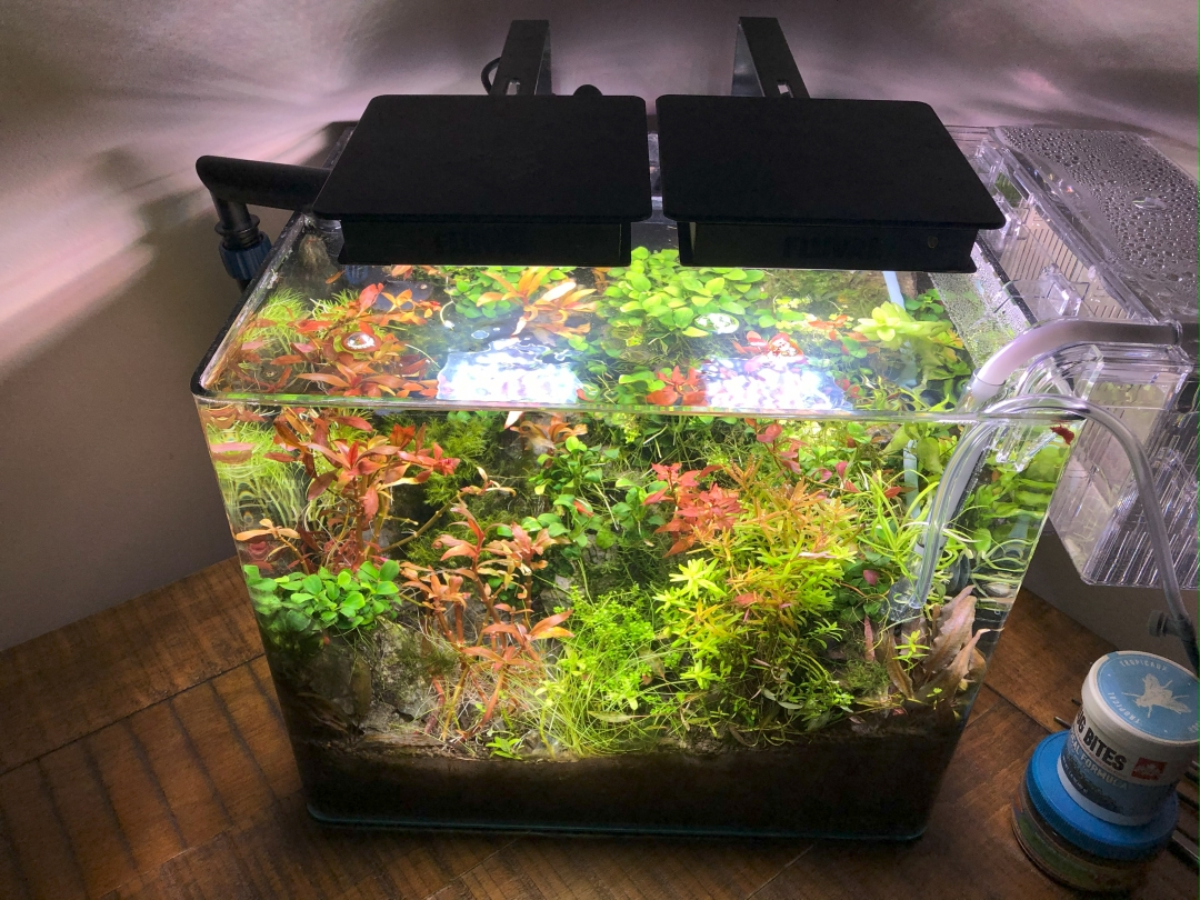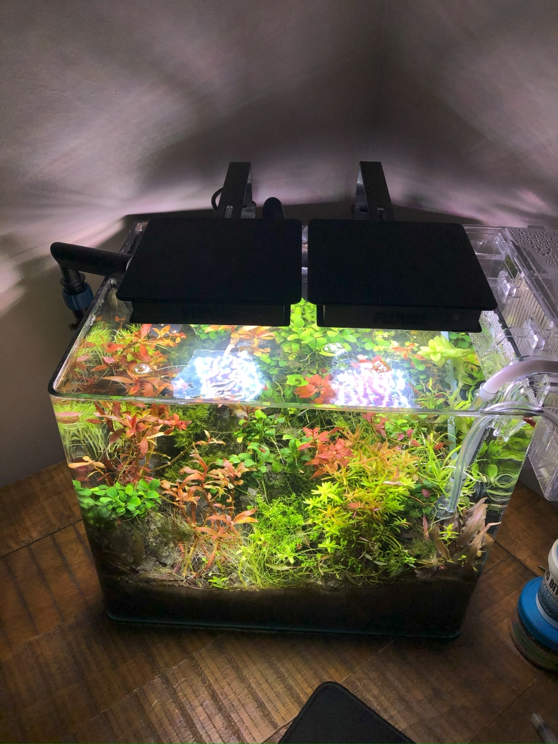 Overflow on the back – inside is 220gph pump. Outside in the tank is 120ghp power head which I will be replacing with 180gph hydor, to be able to adjust the flow direction. Pressurized co2 with Milwaukee regulator 1bps and fluval nano light (3.0). As a substrate on the very bottom layer, I used red fluorite, on top ADA Amazonia soil. For the aquascape I used Seiru Stones and wood branches from local fish store. I am dosing Plantex CSM+B. Plants list: baby tears, Alternanthera reineckii mini, rotala rotundofilia, rotala macrandra, rotala macrandra narrow leaves, cryptocoryne parva, steurogen repens, blyxa japonica and bacopa